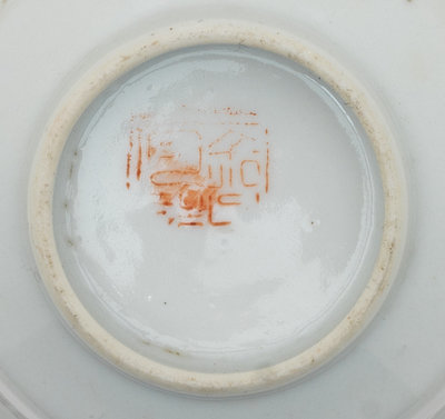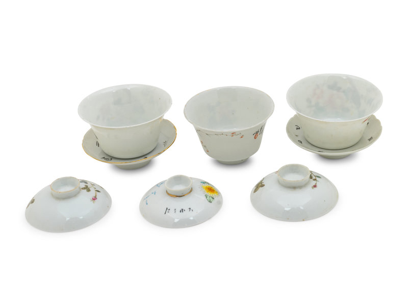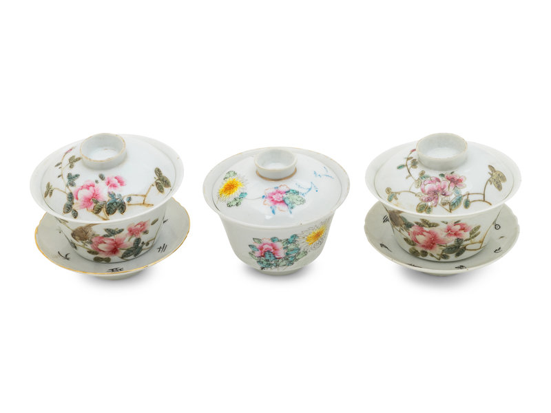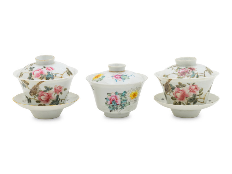 each painted with flowers and birds and gilded at mouth rim, one lacking the stand.