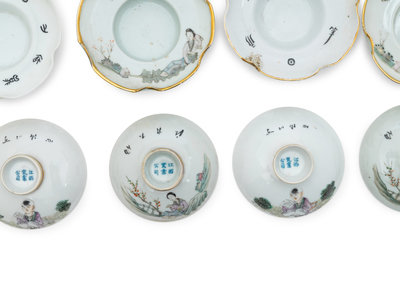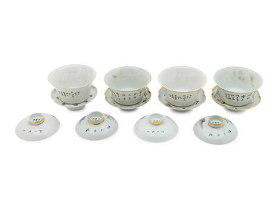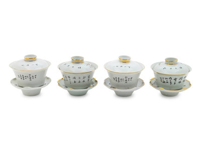 each potted with flaring sides rising to a slightly everted rim, the cover and foliate-rimmed stand has gilt decoration, one pair painted with ladies, the other boys and shoulao figures.