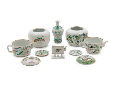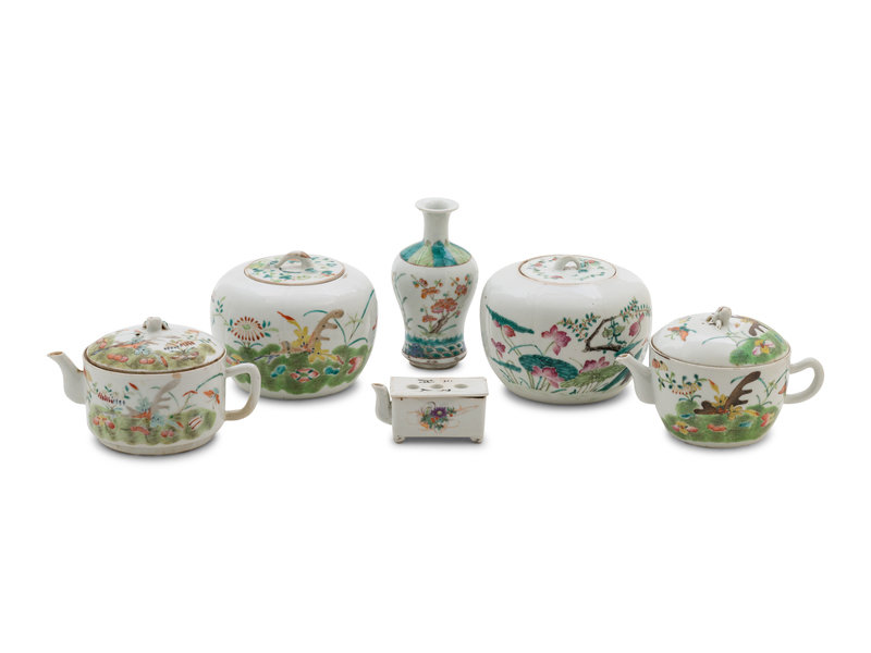 comprising two covered jars, two teapots, one small bottle vase, and one brush holder.