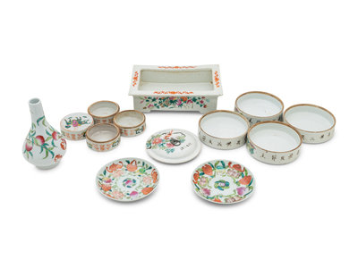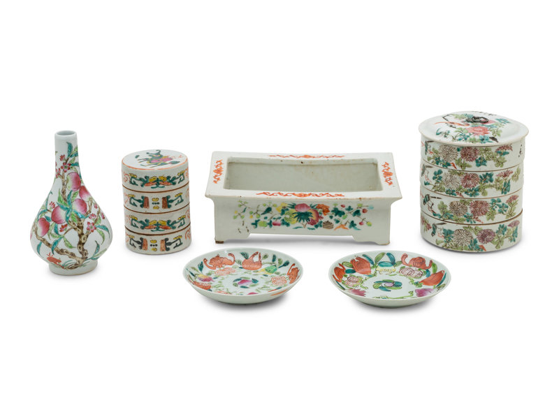 Six Chinese Familles Rose 'Flowers and Peaches' Porcelain Articles