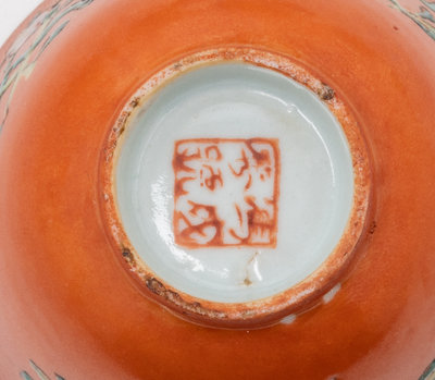comprising four coral red ground cups and five teapots, each painted with flowers and birds.