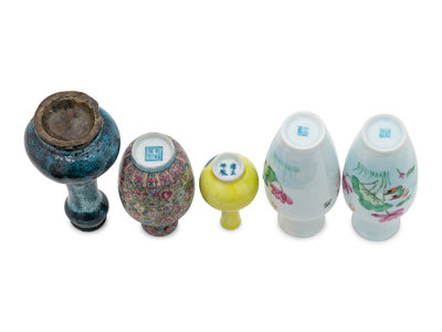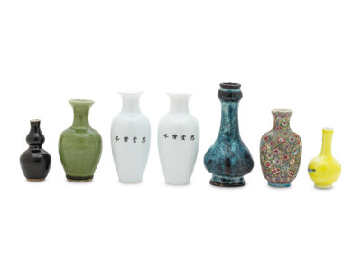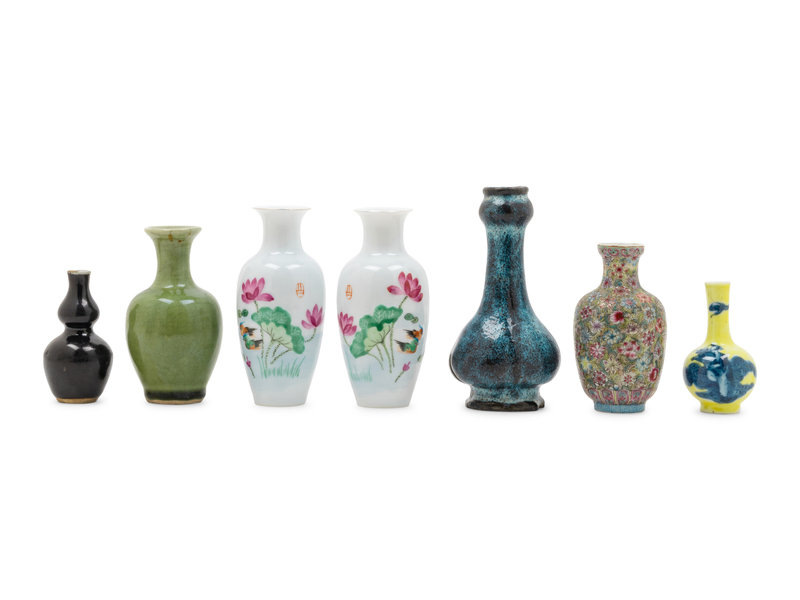 comprising three famille rose baluster vases, one 'millefleur' example and one 'lotus and duck' pair, one yellow ground and underglaze blue bottle vase, and three monochrome glazed examples.