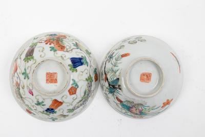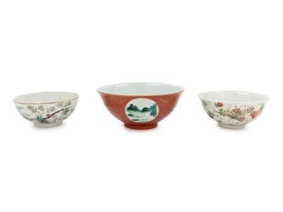 the first decorated with butterflies and melons, the second painted with landscape on a coral-red ground, the third decorated with lotus and rockery.