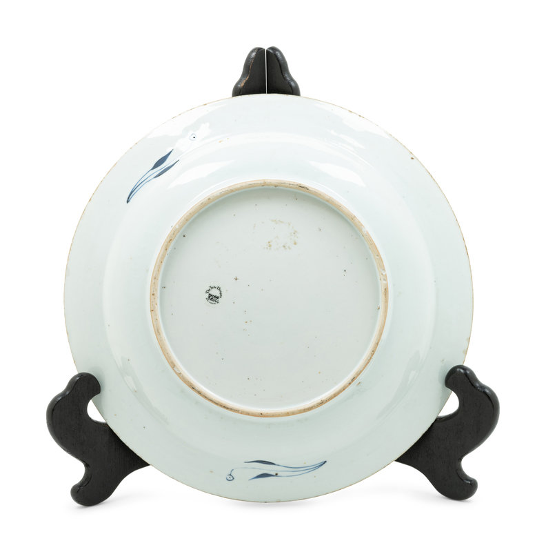decorated in iron-red enamel and gilt on underglaze-blue, depicted a vase and flowers to the central roundle.