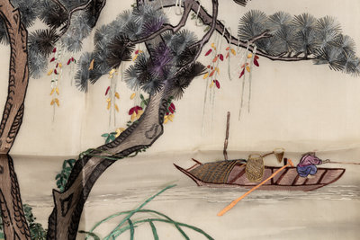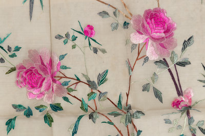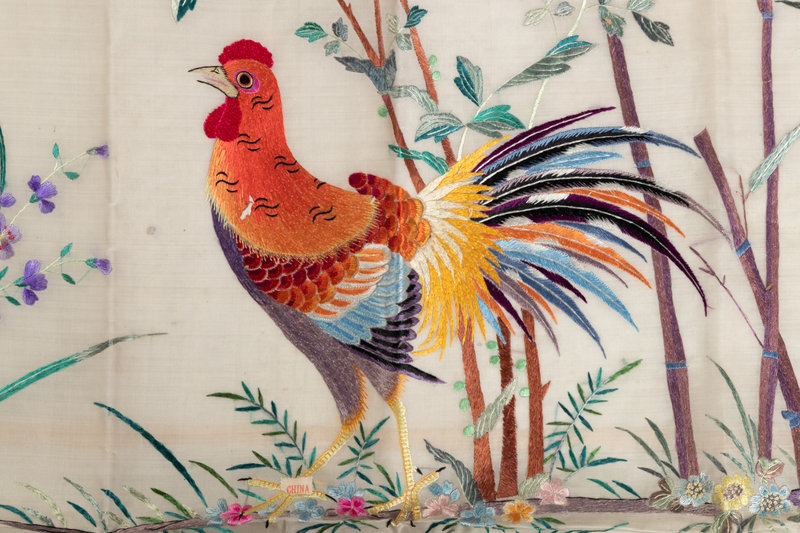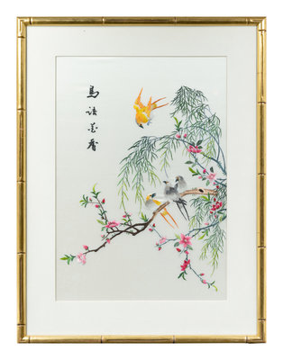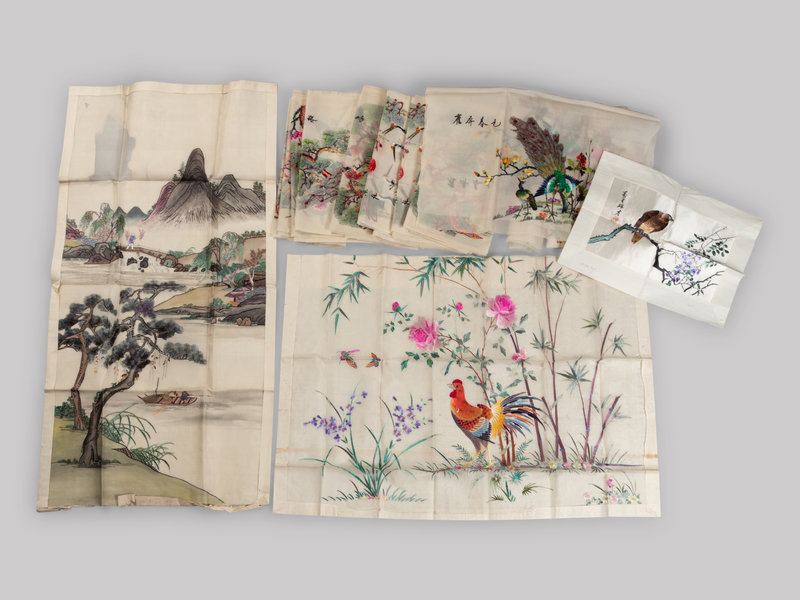 comprising five large framed examples. and over thirty unframed examples, each worked with polychrome satin threads to depict various flora, fauna, and landscapes.