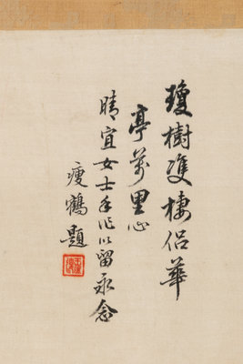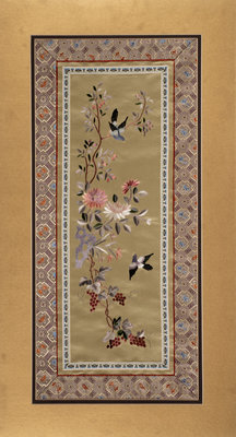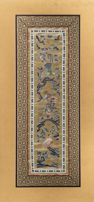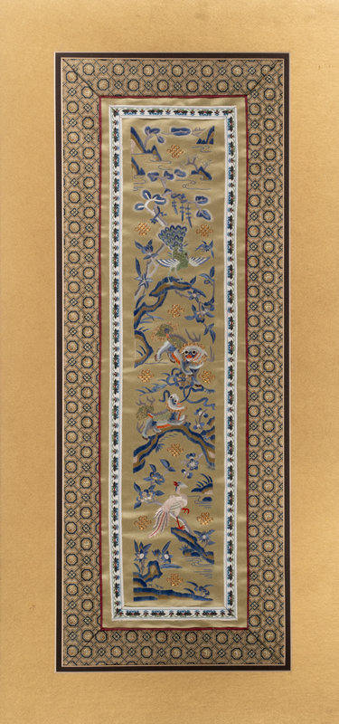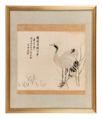 comprising two rectangular pale gold ground examples, and one depiction of a pair of cranes.