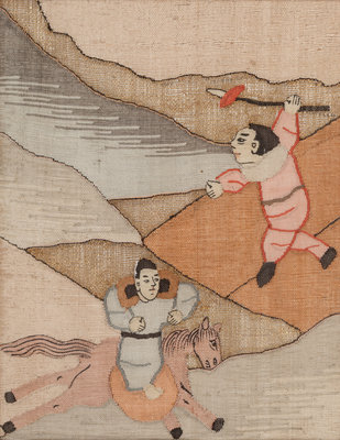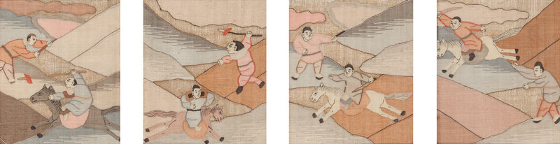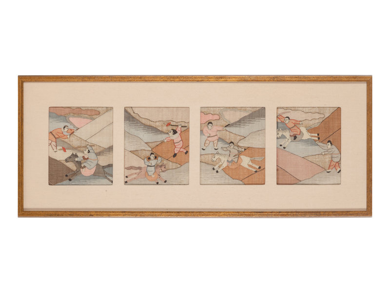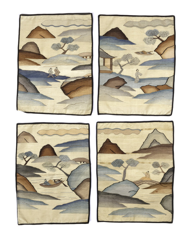 comprising a set of four loose examples, and one framed example containing four panels; each working in multicolor and gilt threads to show figures in a landscape.