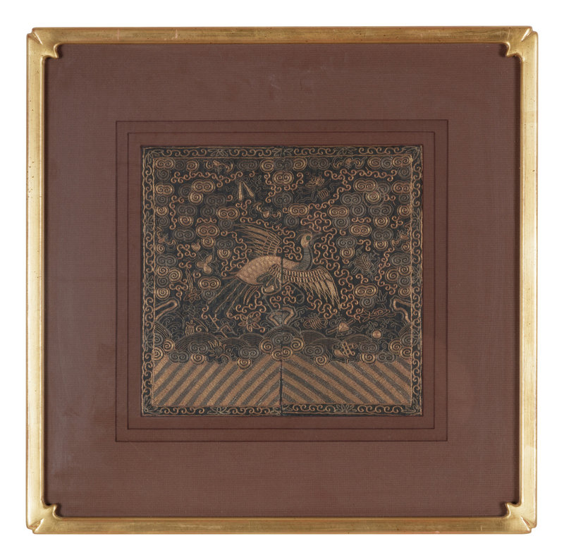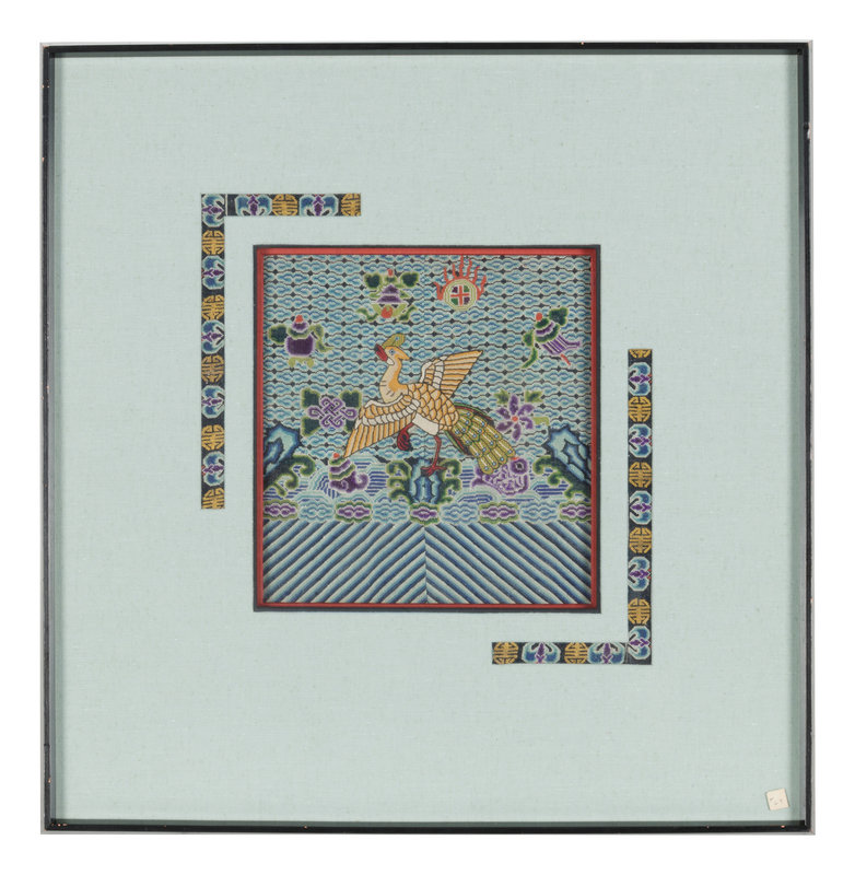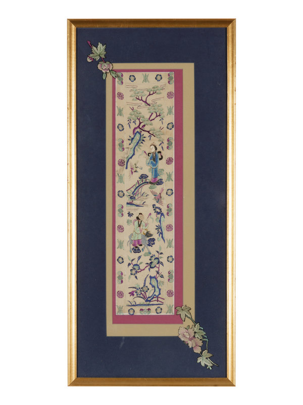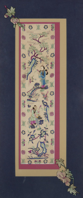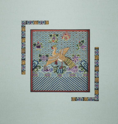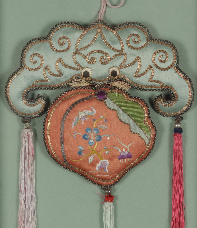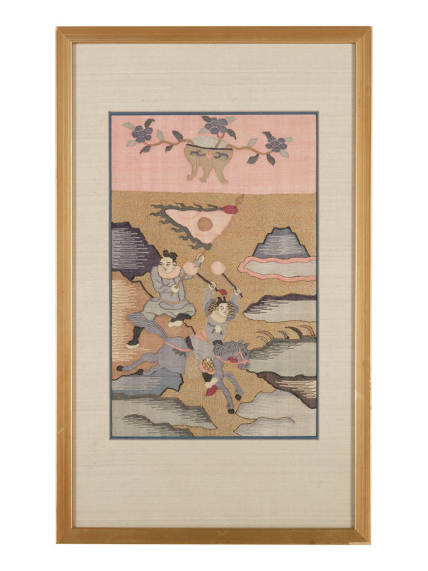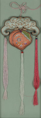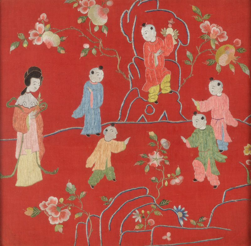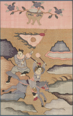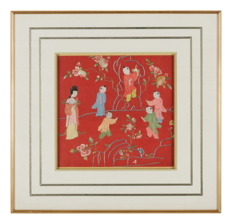 comprising two rectangular rank badges, on red ground embroidered 'boys' panel, one kesi tapestry woven 'warriors' panel, an embroidered collar, four rectangular panel embroidered with various figural and floral motifs, and one tasseled pendant of a bat grasping a peach by the mouth.