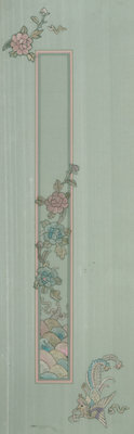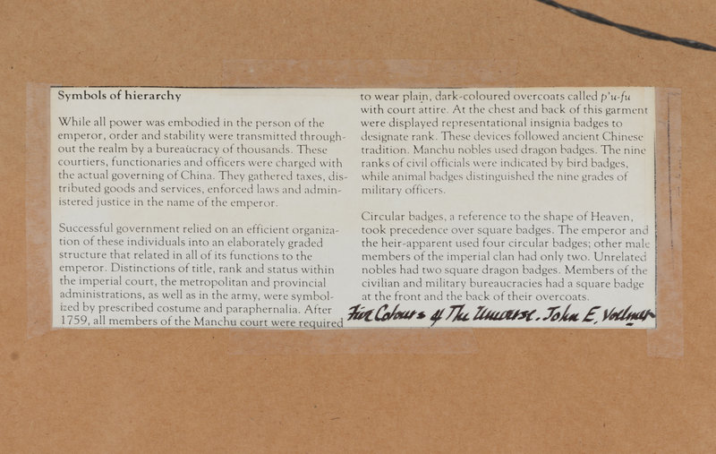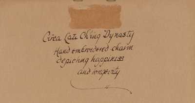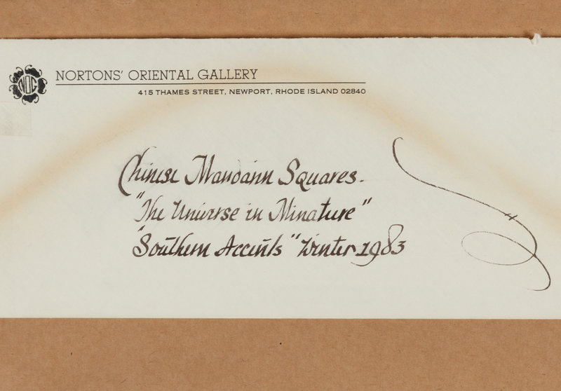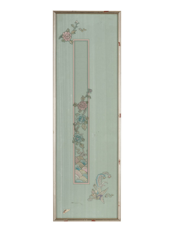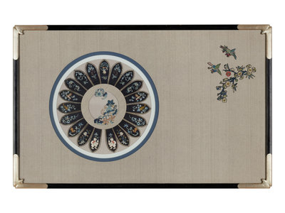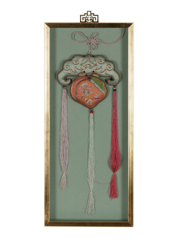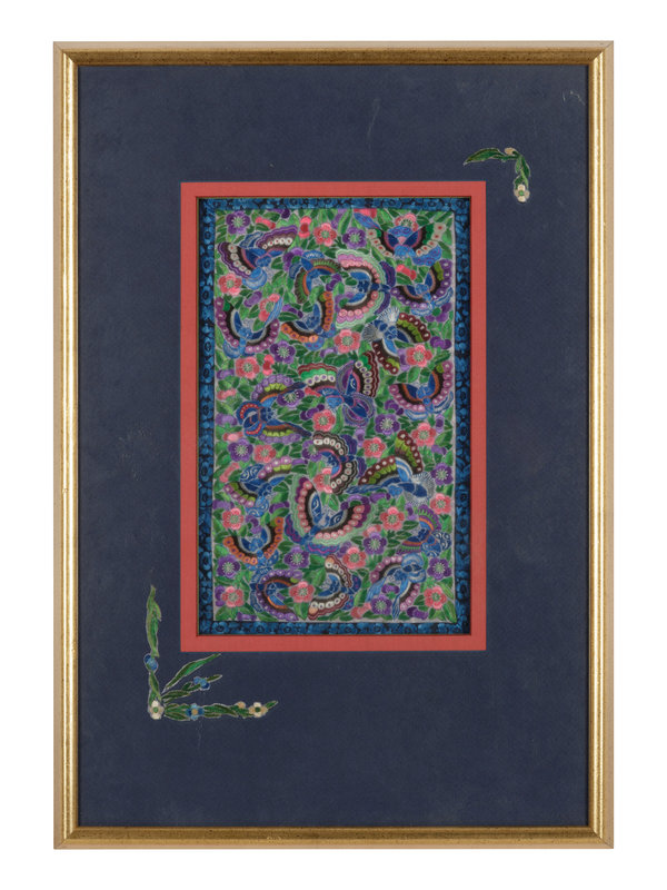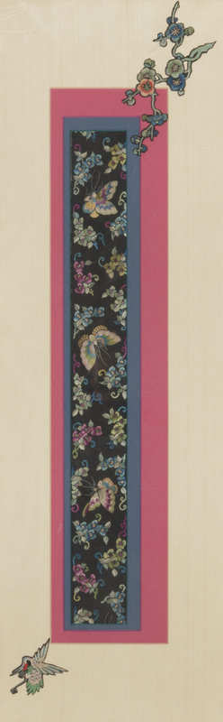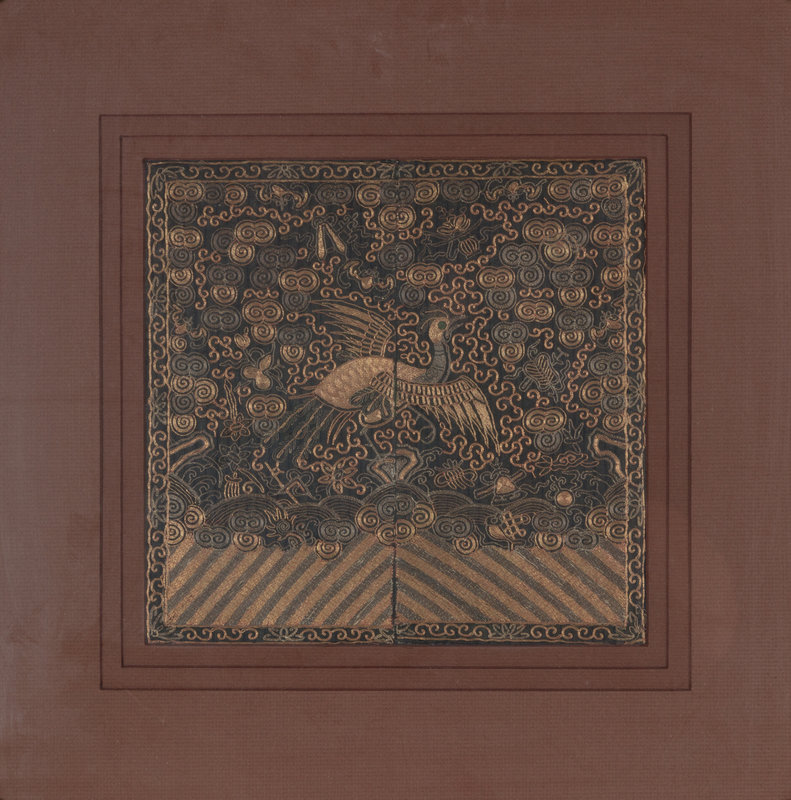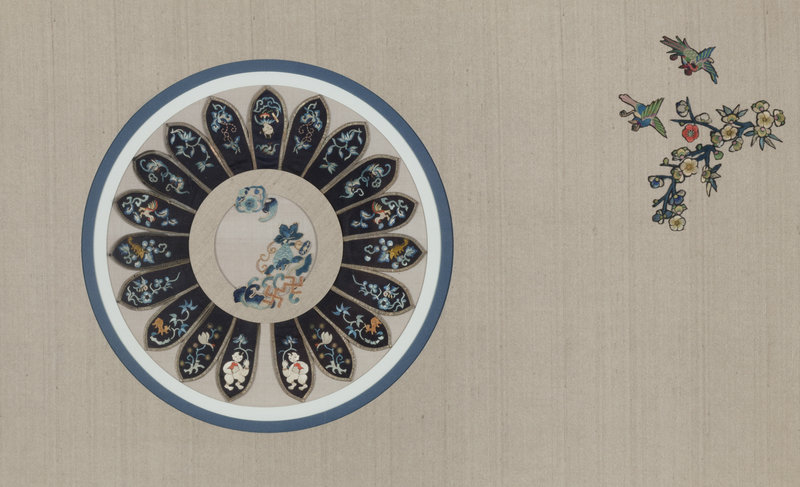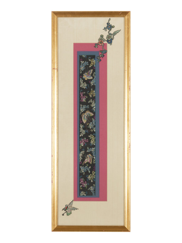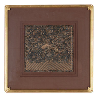 comprising two rectangular rank badges, on red ground embroidered 'boys' panel, one kesi tapestry woven 'warriors' panel, an embroidered collar, four rectangular panel embroidered with various figural and floral motifs, and one tasseled pendant of a bat grasping a peach by the mouth.