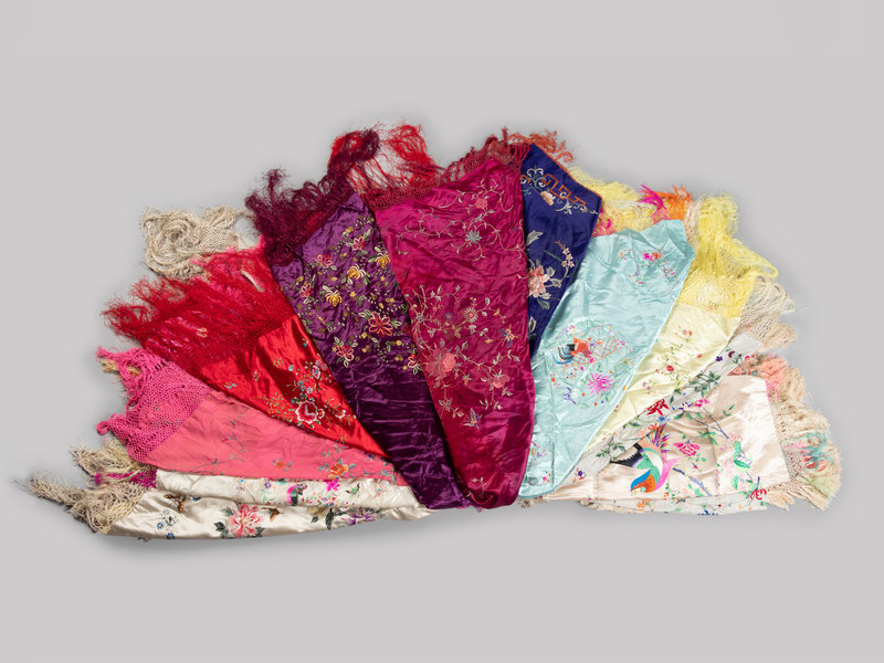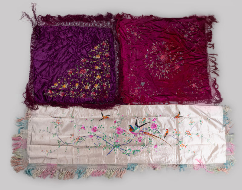 comprising various rectangular, square, and oblong examples, each richly embroidered in polychrome threads with various floral designs, and finished with tassels about the perimeter.