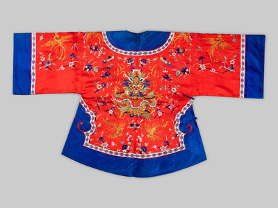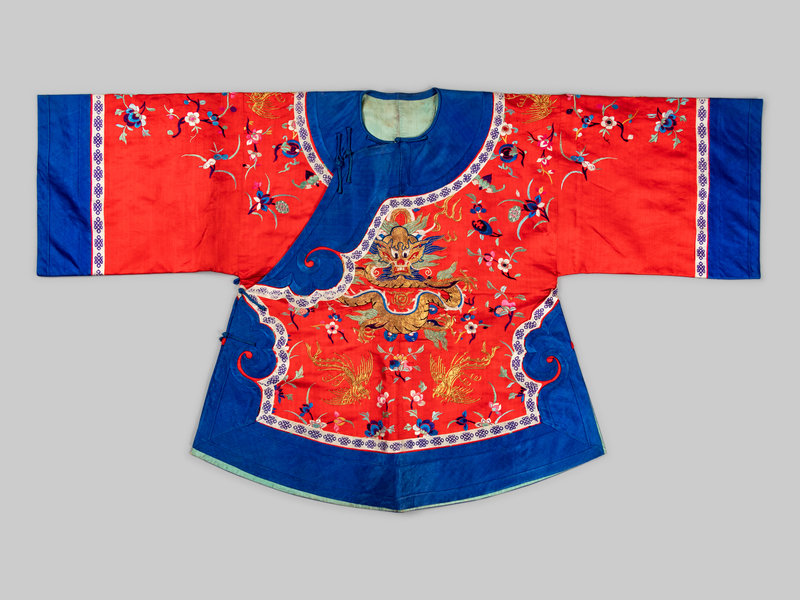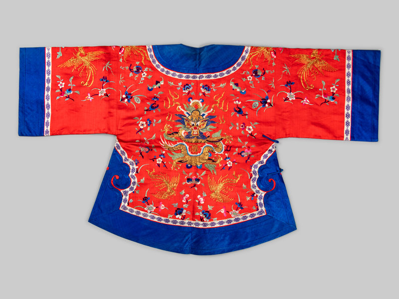 the jacket worked with polychrome and metallic threads to depict dragon, phoenixes and blossoming flowers against a vermillion satin ground and bordered in blue to the collar, cuffs, hem and side closure, fully lined in turquoise silk.