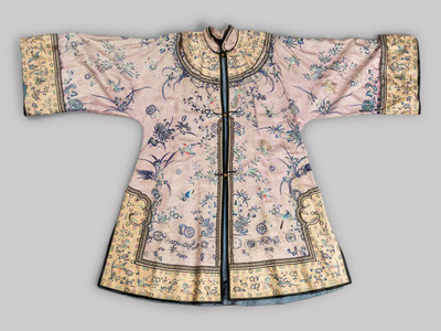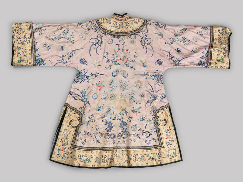 the pale lavender ground woven with flowers and longevity symbols, embroidered in polychrome threads with further floral decoration, the ivory borders at the hem, cuffs, and collar worked en suite, with further ribbon borders framing the central closure.