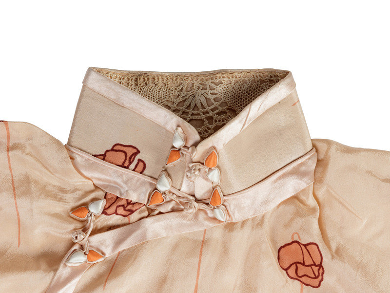 comprising two peach ground examples with single-sided angled fronts, one of a printed lightweight weave, the other a brocade example with dragon and phoenix against a scrolling cloud ground, the third a pale pink example, with a silk embellished toggles across the front.