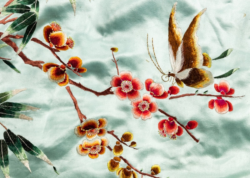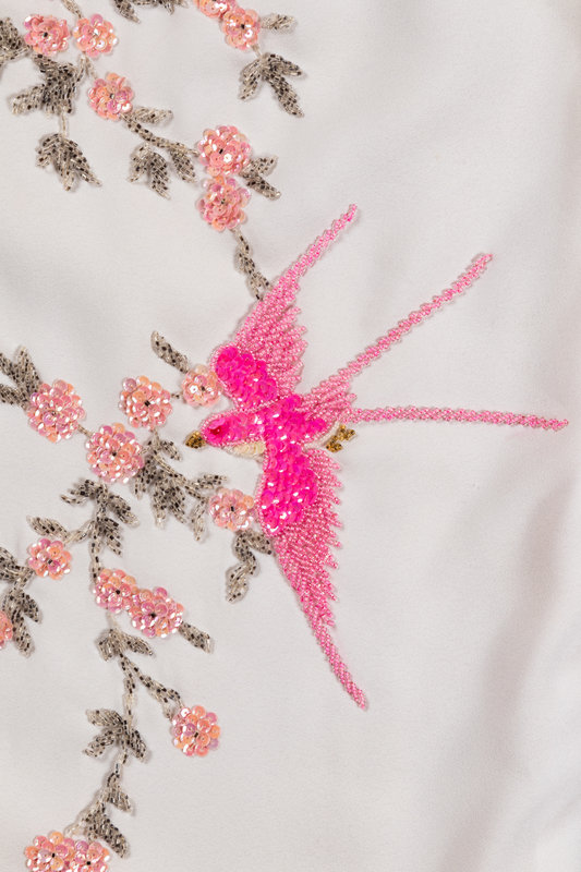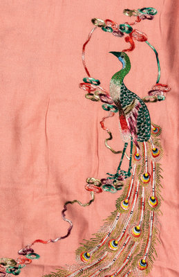 comprising a fitted sleeveless example, embellished with sequins and having a side zipper closure, and two short-sleeved examples, richly embroidered in polychrome threads with bird and flower scenes, and single-sided angled front flaps finished with silk toggle closures.