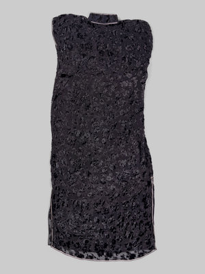 comprising two woven examples, each having long sleeves with beaded and embellished angled single-sided front flap, and one black ground devoré cap-sleeved example.