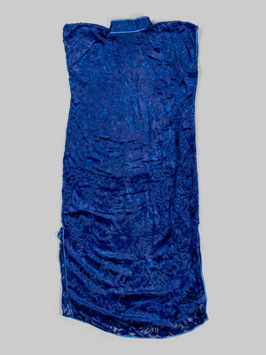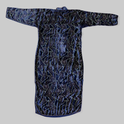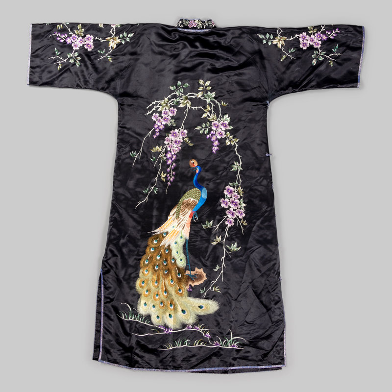 comprising two long sleeve and one cap sleeve example, each having a single-sided angled front embellished with silk toggles, the first a velvet example embellished with silver tone floral designs, the second a black satin ground example, embroidered with a peocock, the third a royal blue devoré example.