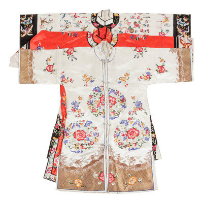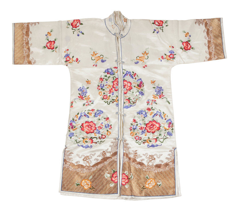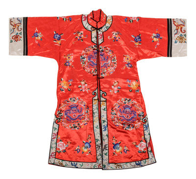 comprising two cream ground and one red ground example, each richly embroidered and finished with central button toggle closures.