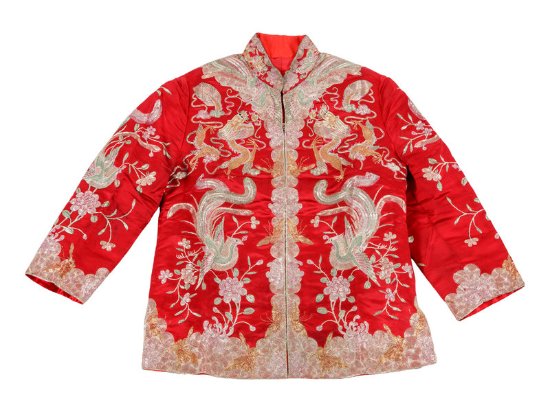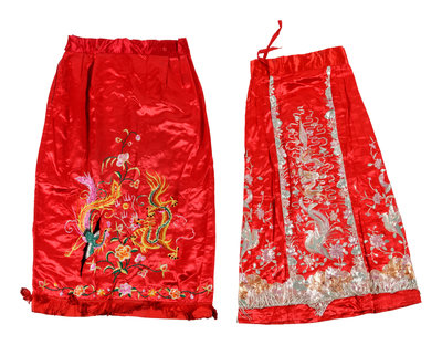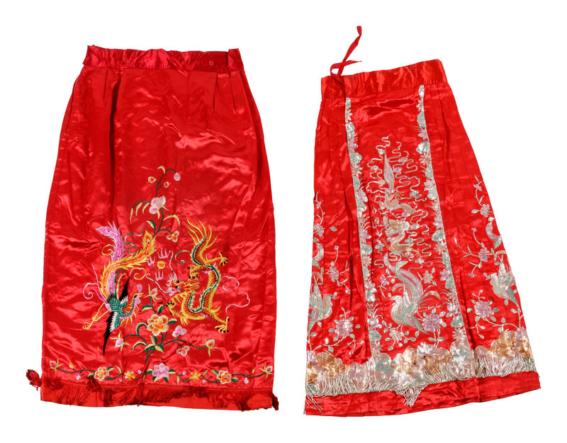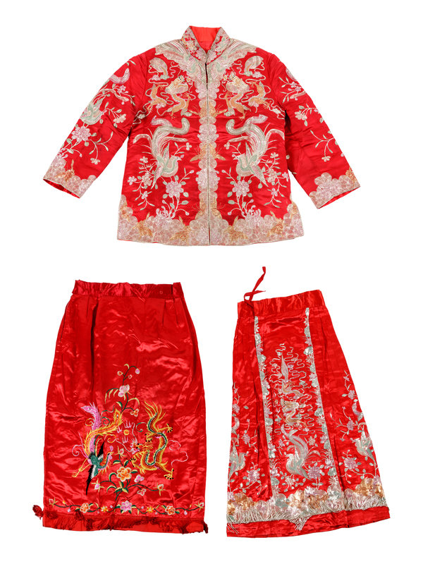 A Chinese Embroidered Silk Wedding Gown and Skirt