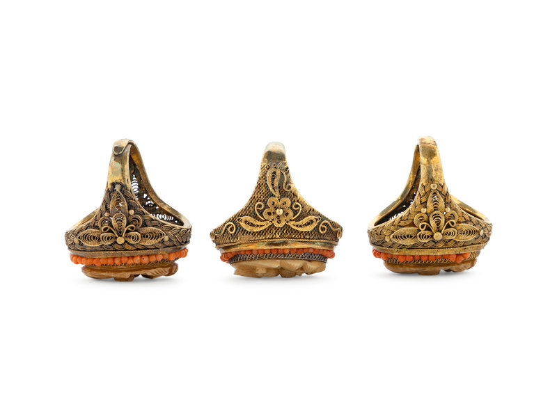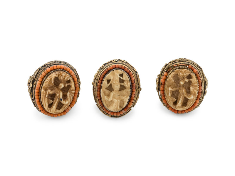 each adjustable ring having a carved inset medallion surrounded by coral beads within a filigree setting worked with floral designs.