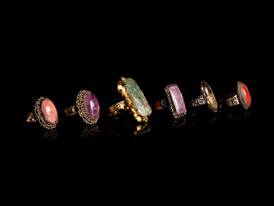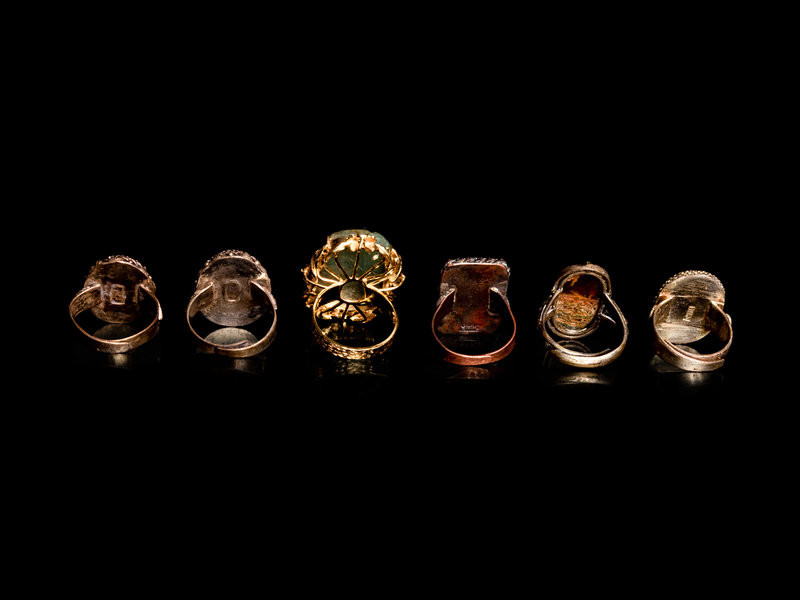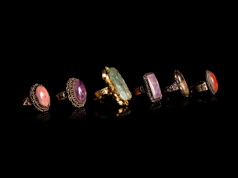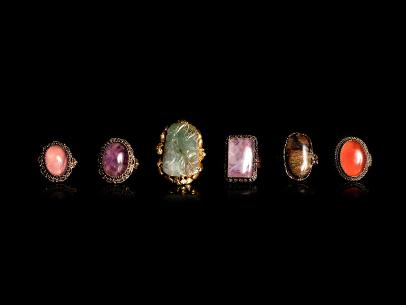 Six Chinese Hardstone Inset Metal Mounted Rings