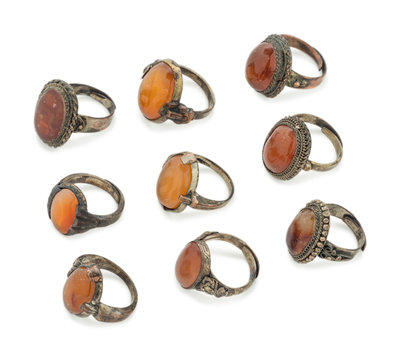 Nine Chinese Carnelian Agate Inset Metal Rings