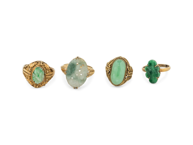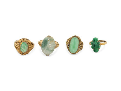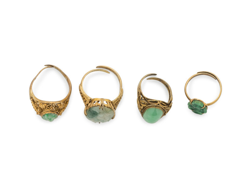 Four Chinese Silver-Gilt Mounted Jadeite Rings