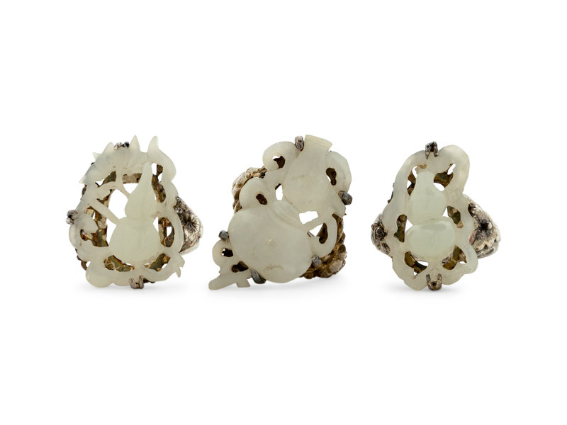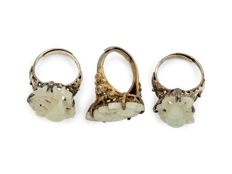 Three Chinese White Jade Inset Silver Rings