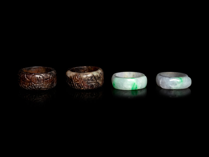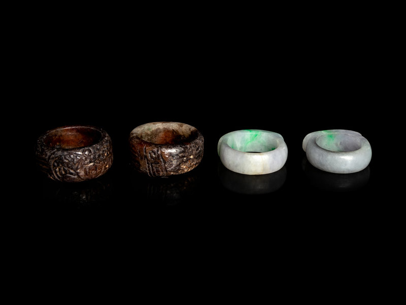 Two Chinese Jadeite Archer's Rings and A Pair of Chinese Hardstone Ring
