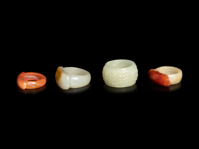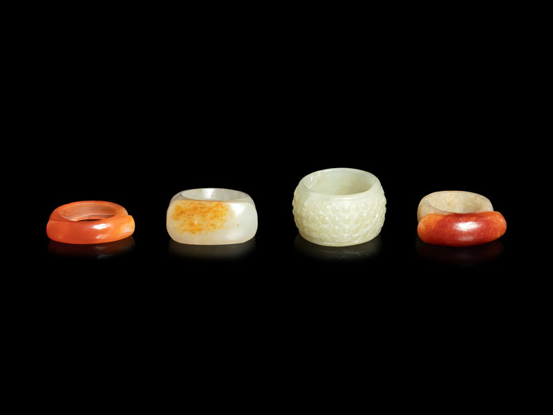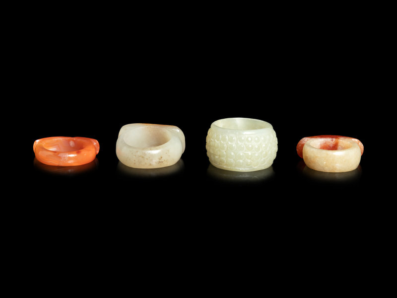 comprising a pale celadon example with raised bosses, a russet and white jade example, an agate example and a russet and celadon hardstone example.