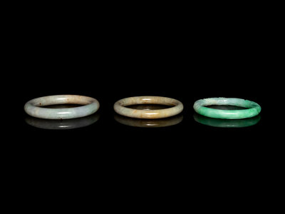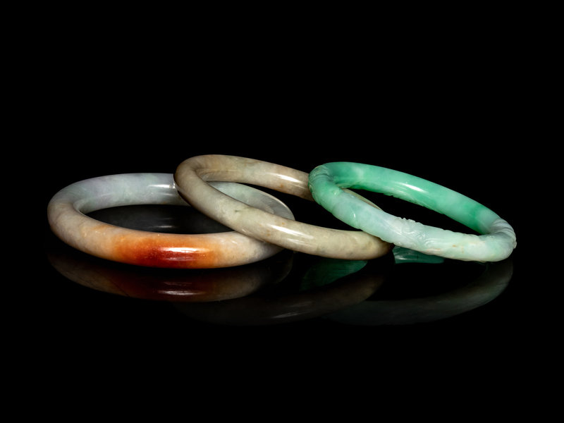 each of cylindrical form, comprising two russet and pale celadon examples, and one apple green and white example with relief carved decoration.