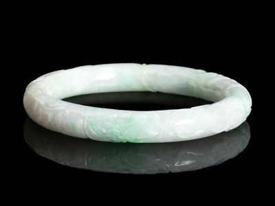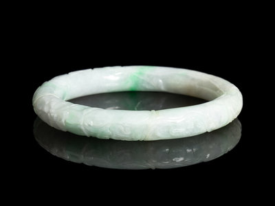 A Chinese Carved Apple Green and White Jadeite Bangle