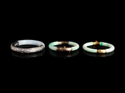 Three Chinese Silver and 14K Yellow Gold Jadeite Bangles