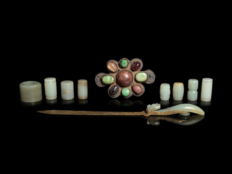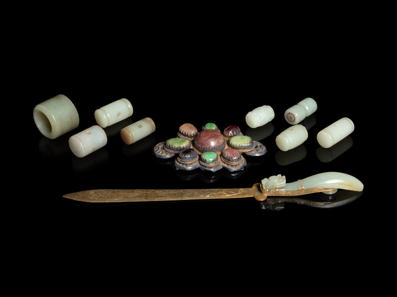 comprising seven cylindrical pendants, one archer's ring, one belt buckle daigou mounted brass letter opener, and one tourmaline inset lady's buckle.
