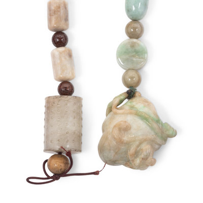 comprising two long strands of circular beads, one of pebble form beads with a lotus pod pendant, and one of tubular beads.