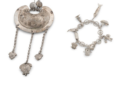 comprising two small charm bracelets, one charm necklace and one necklace suspending a ruyi lock-form pendant.