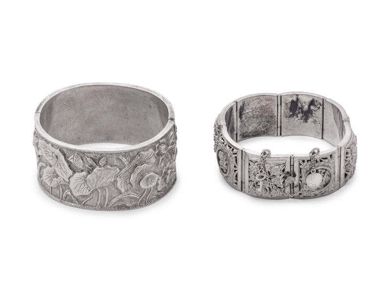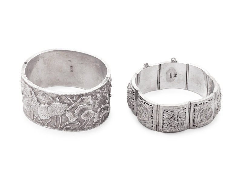 comprising one wide hinged example worked with a continuous lotus scene, and one square link example with a chain clasp, each marked 'silver'.