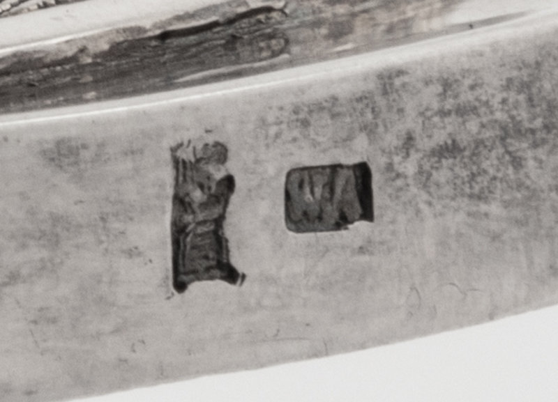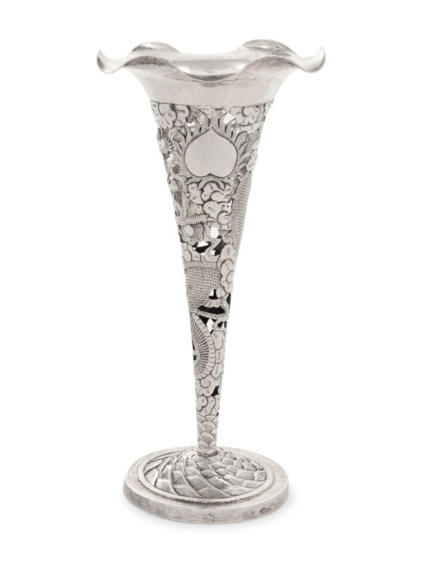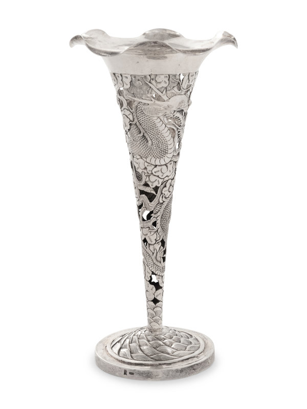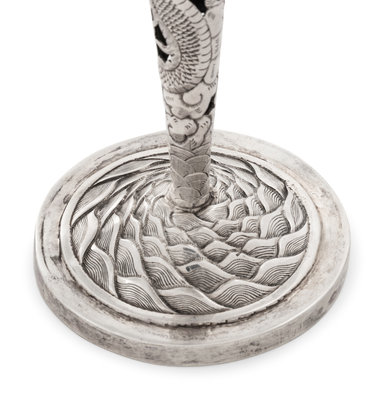 the conical body above a raised foot tapered to wide hexafoliate mouth rim, chased with a reticulated dragon writhing above waves; marked 'WA' and a eligible mark to foot rim.