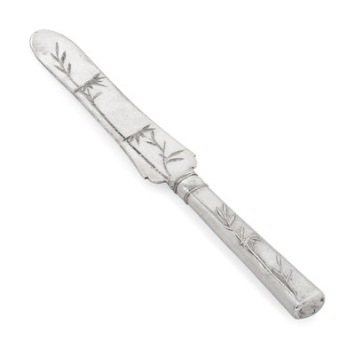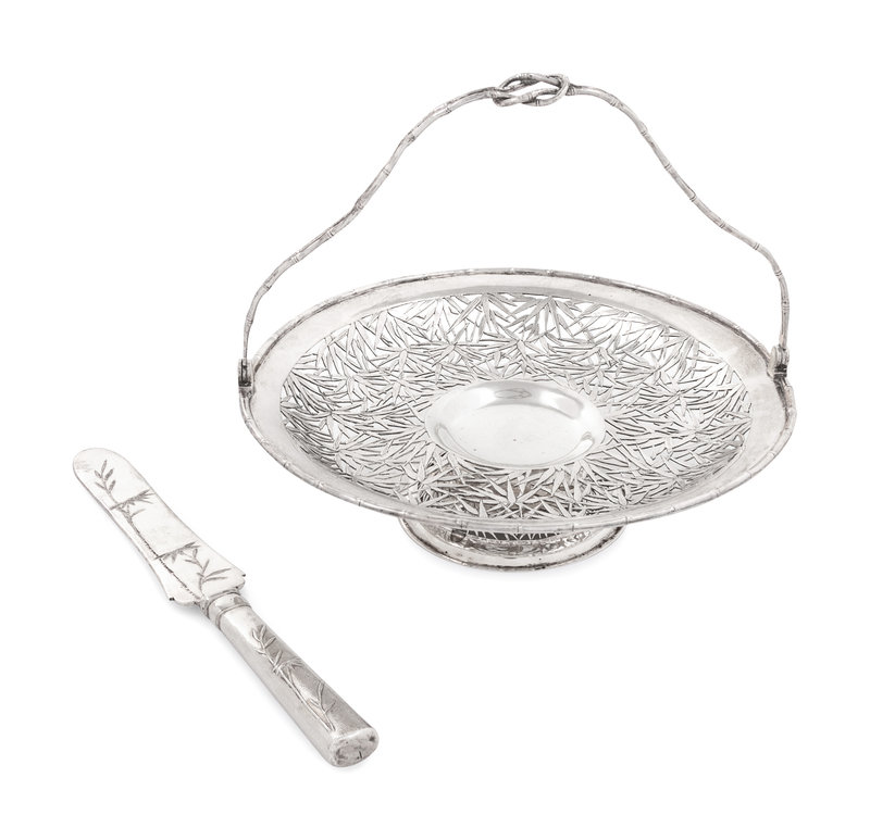 comprising a standing basket with reticulated bamboo leaf design and handle in the form of a knotted bamboo stalks; marked '聯祥盛', 'WH' and '90', and a serving knife of similar decoration; marked '兆彰' and 'Yatbun'.