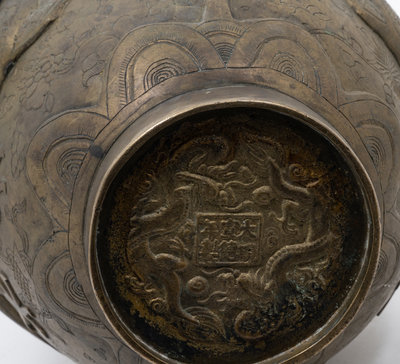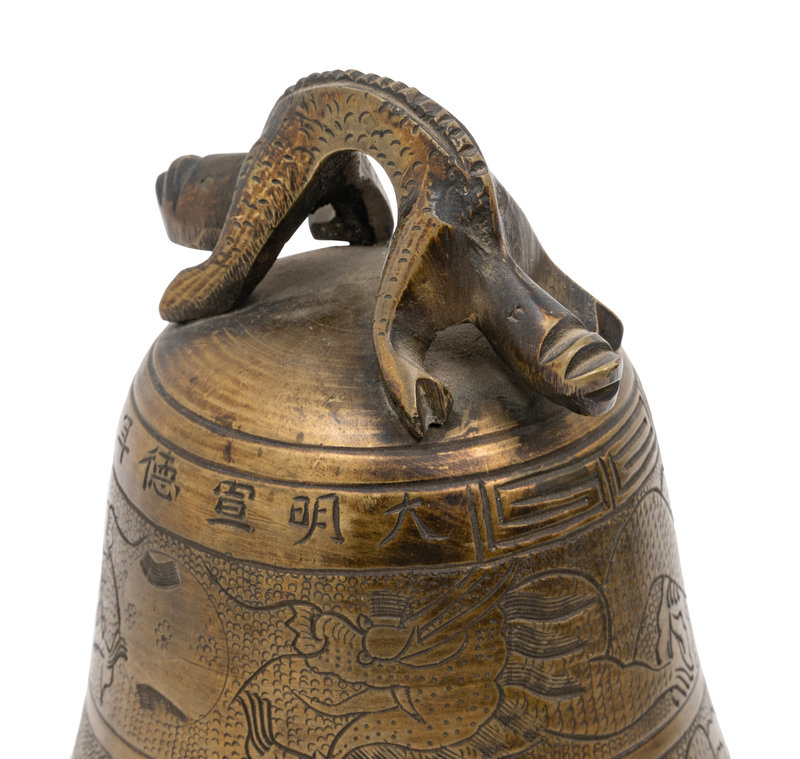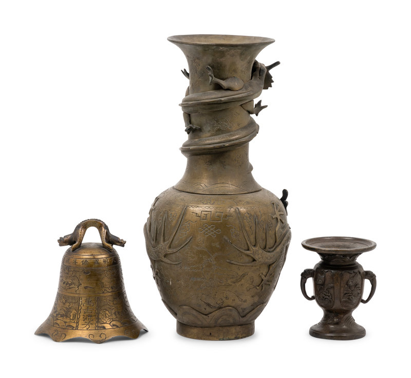 comprising one bell, one vase with dragons chasing a flaming pearl, and one small vase with looped handles.