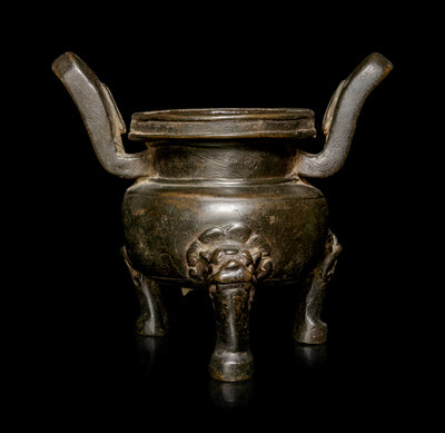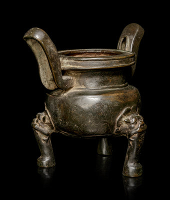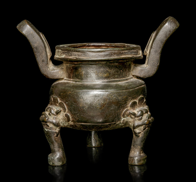 the rounded body raised on three cabriole legs with lion mask terminals, two upright handles rising from the short straight neck underneath a galleried mouth, the exterior incised with floral design.