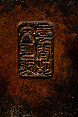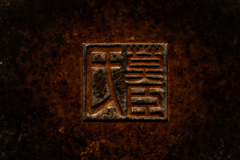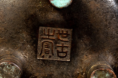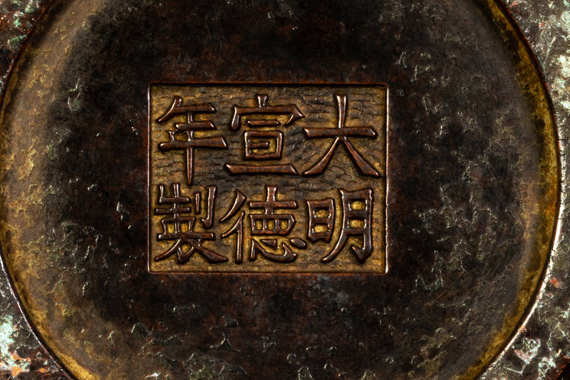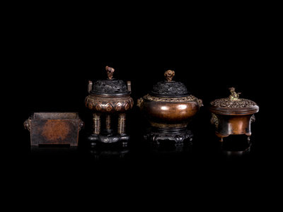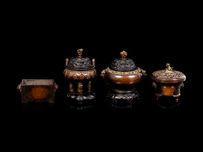 the first a tripod example, the second a compressed globular example with wood cover, the third of flared shape with a pair of mythical beast handles, the last a square sectioned example.
