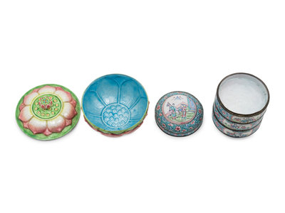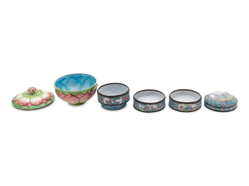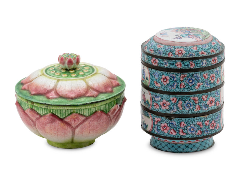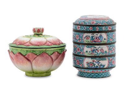 the first a covered bowl in the shape of a lotus, the second a four-tiered covered box, painted with figures in shaped panels against a turquoise ground.