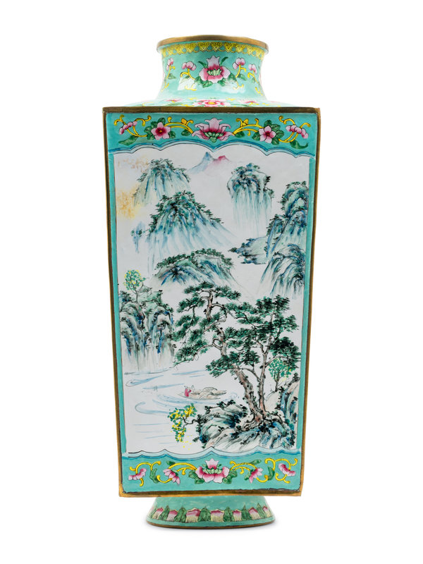 of square section and raised above a tapering foot, narrowing to a rounded short neck terminating in a copper-rimmed mouth, finely painted to the exterior with landscape scenes reserved by foliate sprays again the turquoise ground.