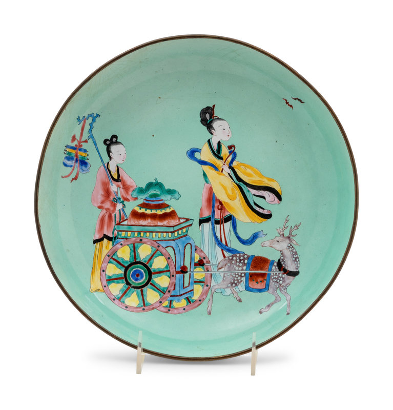 of rounded form with shallow sloping walls, painted to the interior with a the diety Magu accompanied by a spotted deer and attendant against a turquoise ground.