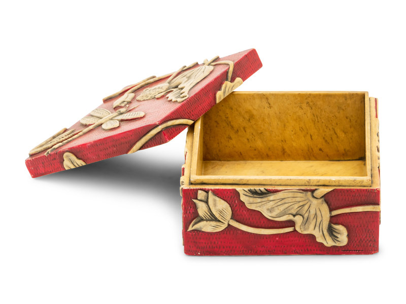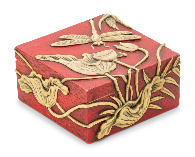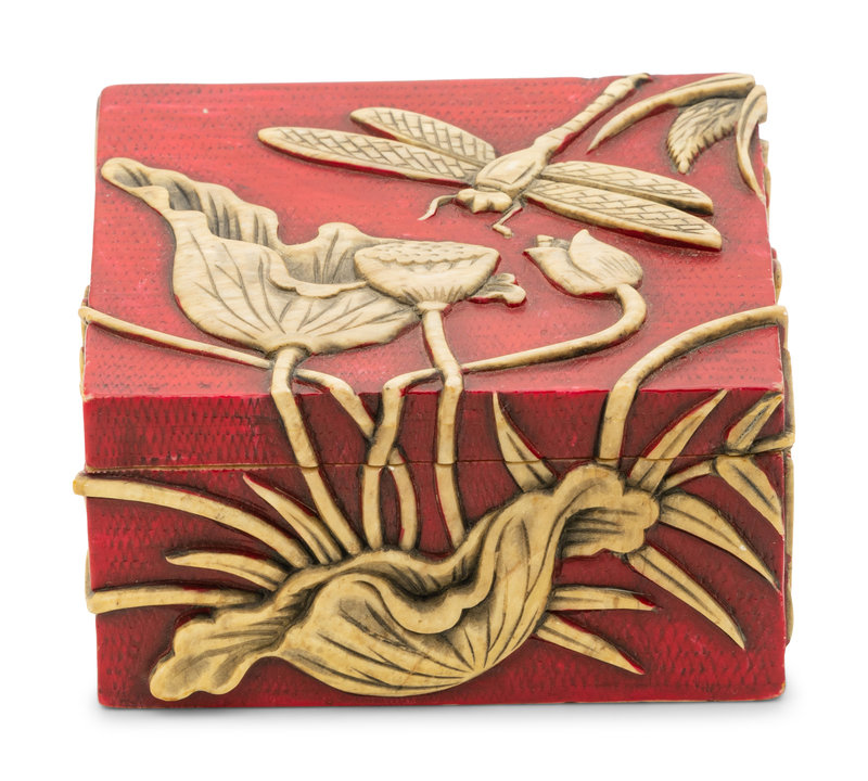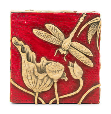 of square form, the box and conforming lid carved in relief with dragonfly and lotus against a red cell ground.