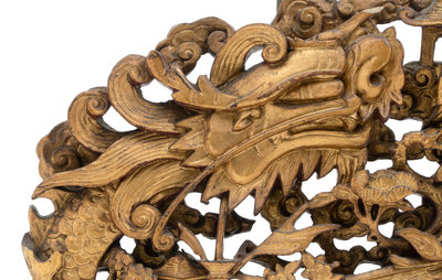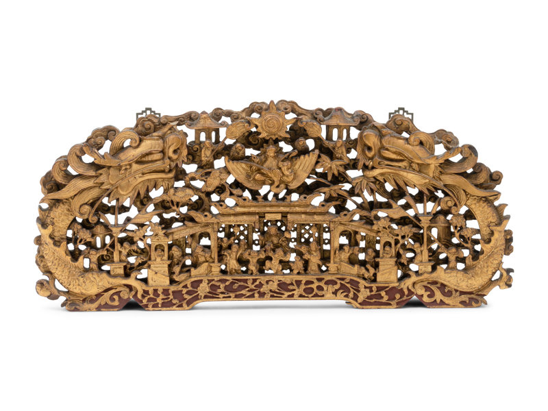 of an arched shape, carved with figures on a pavillion, surrounded by dragons, cranes, and clouds.