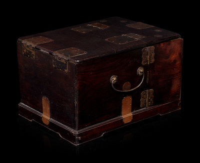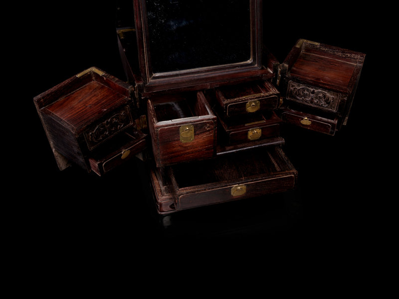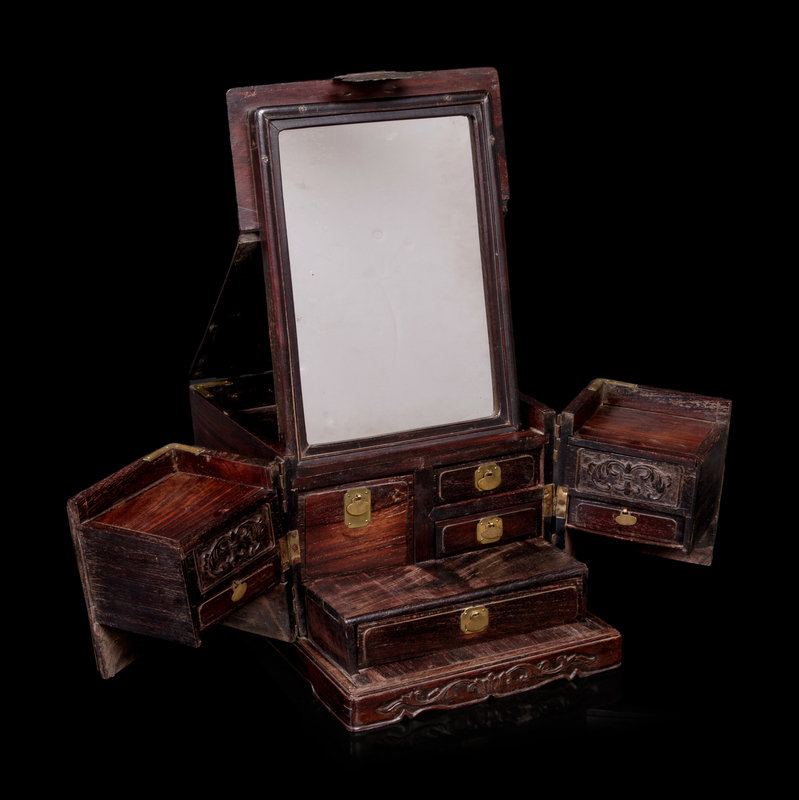 of square form with a pair of doors opening to seven removable drawers, all with copper hinges and drawer pulls, surmounted by a folding mirror stand.