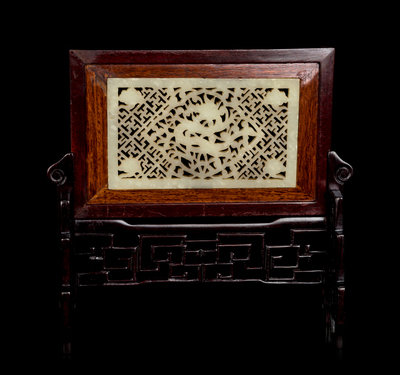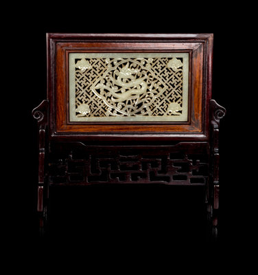 A Chinese Jade Inset Hardwood Inkstone Screen