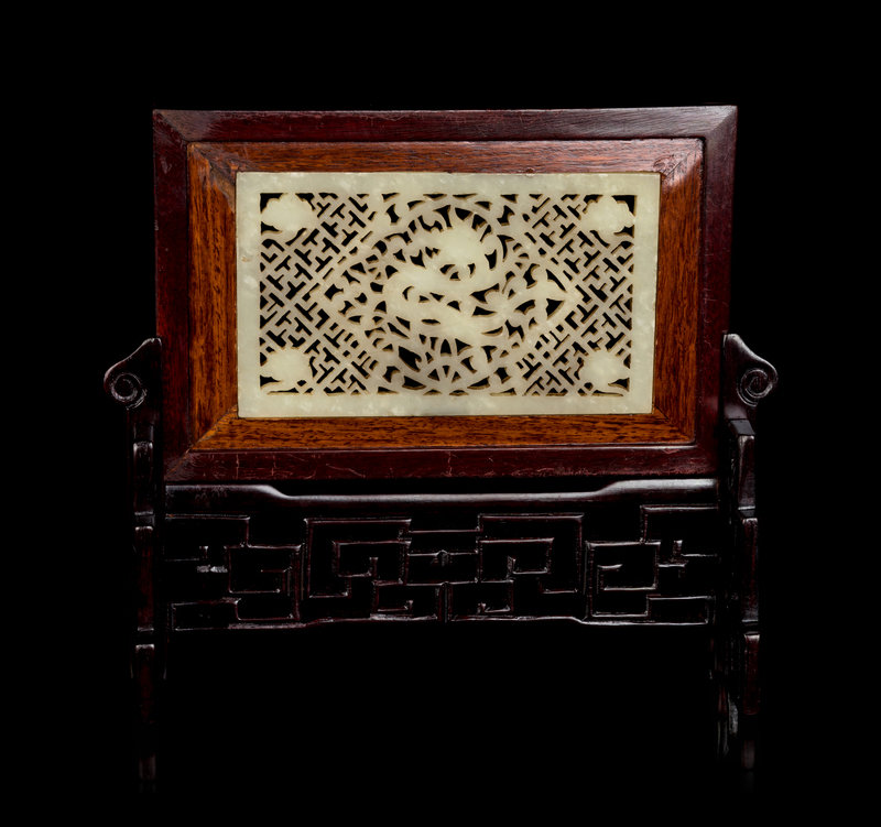 the pale celadon jade plaque carved and reticulated to show a dragon against a fret ground, all set within a conforming hardwood frame supposed by an easel stand carved with reticulated feet and apron.