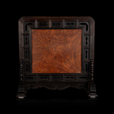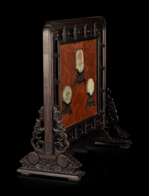 the reticulated frame of rectangular section about a burlwood panel inset with three pale celadon jade plaques raised above stands, all supported by a reticulated easel stand.